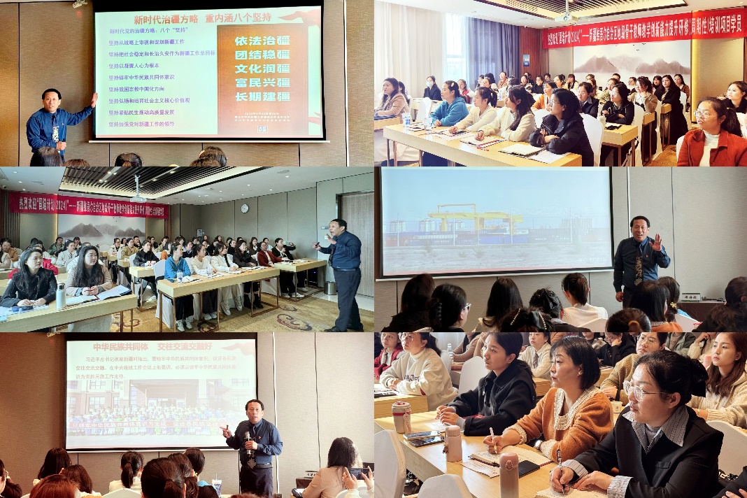 情满天山遍地春光,治疆方略生根开花。11月23日,教育部“国培计划(2024)”——新疆维吾尔自治区地级骨干教师教学创新能力提升研修(周期性)培训项目继续授课,来自新疆四个州50位教学骨干参学。徐州市委宣讲团成员、徐州市党员教育先锋师资、888集团官网888集团线上网站周海航副院长受邀作题为《行固本之举  成长治之疆——新时代党的治疆方略》专题报告。周海航以站立式宣讲的方式,用三个小时的时间,理论联系实际,对新时代党的治疆方略进行了深刻阐释。报告强调,要完整准确地理解新时代党的治疆方略的重大意义、思想内涵、基本特征,既要理解其内容,也要理解其历史逻辑、理论逻辑和实践逻辑,学以致用,牢牢扭住社会稳定和长治久安总目标,发挥教育科技人才的基础性战略性支撑作用,奋力谱写中国式现代化新疆篇章。报告受到新疆参培教学骨干的热烈欢迎。